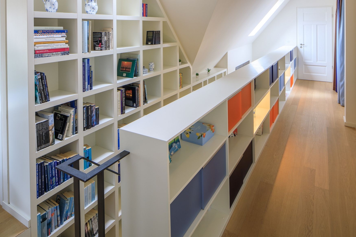 – individuell designtes Regal über die gesamte Länge auf der Galerie