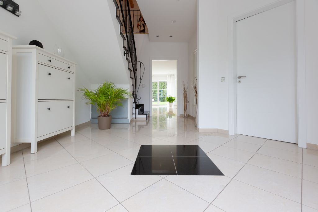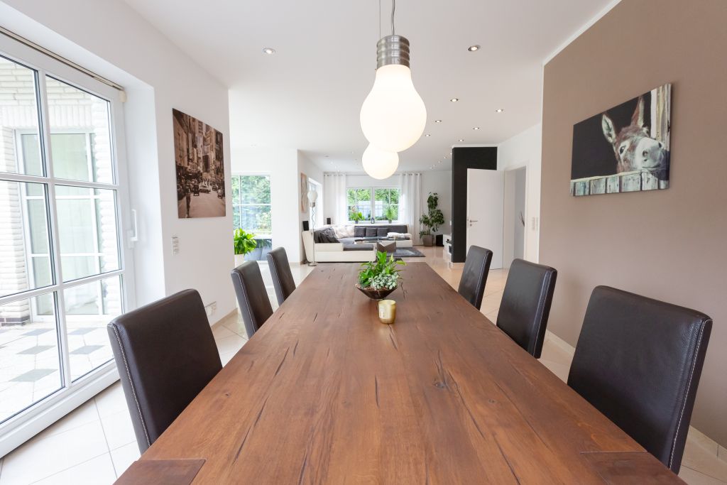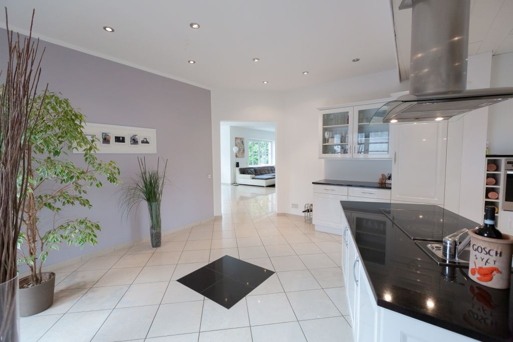 Bereits der großzügige, lichtdurchflutete Eingangsbereich vermittelt einen ersten Eindruck vom gehobenen Wohnkomfort dieser stilvollen Immobilie. Der offen gestaltete Wohn- und Essbereich mit bodentiefen Fenstern und Blick in den parkähnlich angelegten Garten besticht durch seine Helligkeit und einladende Atmosphäre.