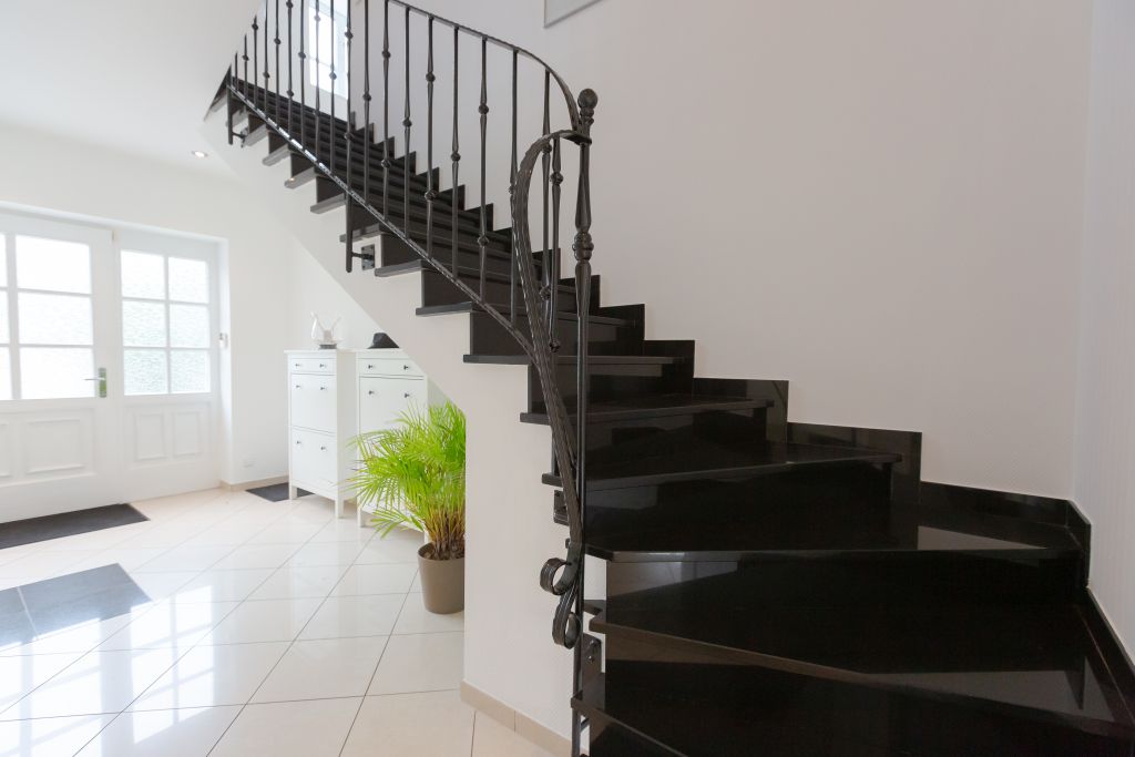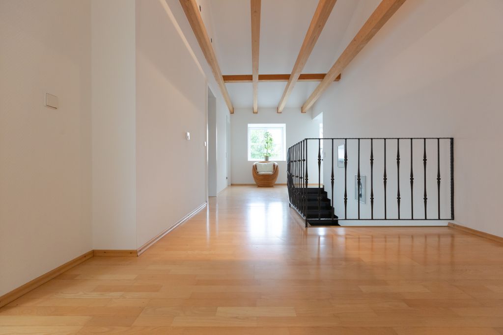 Über eine elegante Treppe gelangen Sie in das Obergeschoss des Hauses. Hier erwarten Sie vier vollwertige, helle Schlafzimmer, darunter ein großzügiges Hauptschlafzimmer mit separatem Ankleidebereich und einem hochwertig ausgestatteten Bad en suite. Zwei der weiteren drei Schlafzimmer verfügen über bodentiefe Fenster mit herrlichem Blick in den Garten. Ein zusätzliches Familienbad bietet ideale Voraussetzungen für einen reibungslosen Start in den Tag – perfekt für die große Familie. Ein weiteres 25 m² großes Zimmer mit angrenzendem Bad ist der perfekte Fitness- oder Arbeitsbereich.