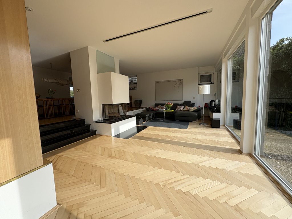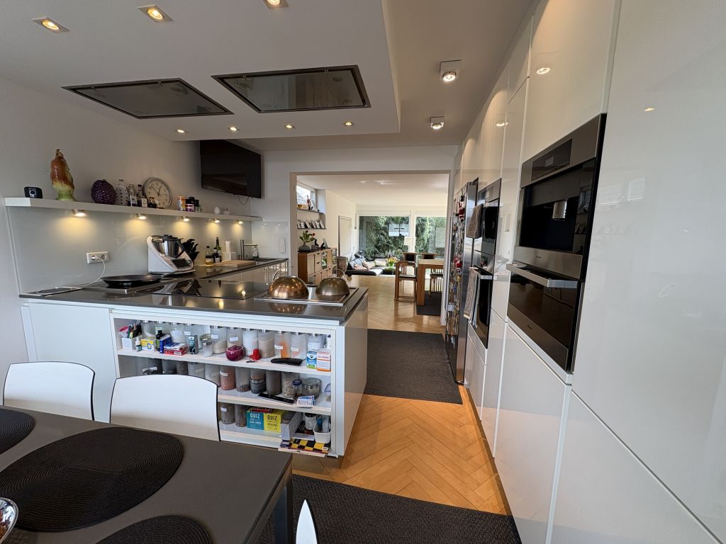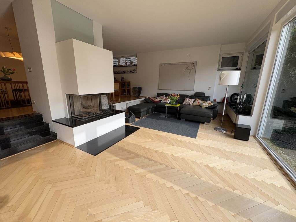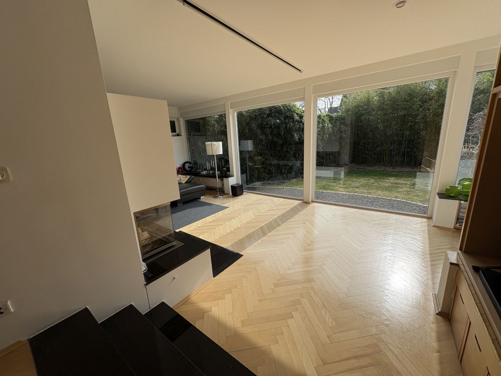 Großzügiger Wohnbereich mit separatem Eingang, offenem Wohn-/Essbereich, hochwertiger Küche mit Kochinsel, Kamin sowie direktem Zugang zur Südterrasse und in den Garten. Der hintere Wohntrakt umfasst zwei große Zimmer mit Ankleiden, ein modernes Bad mit Regenwalddusche, ein weiteres Badezimmer sowie ein Gäste-WC. Ergänzt wird das Angebot durch einen ca. 28 m² großen Fitnessraum mit Gartenzugang.