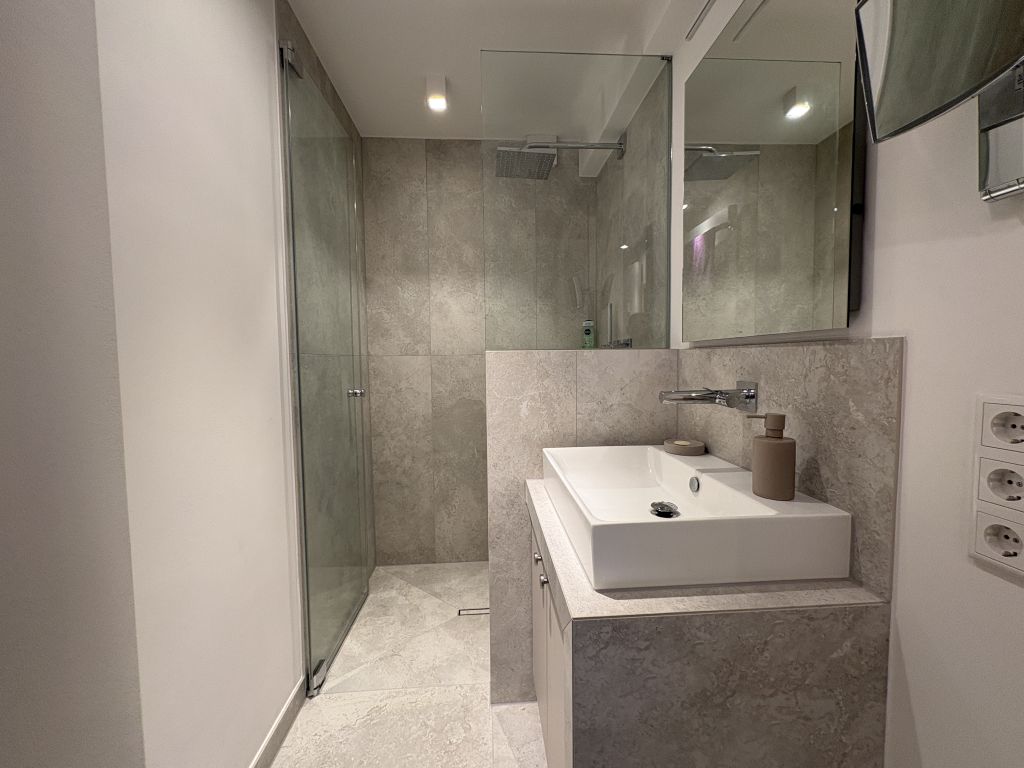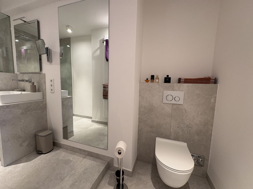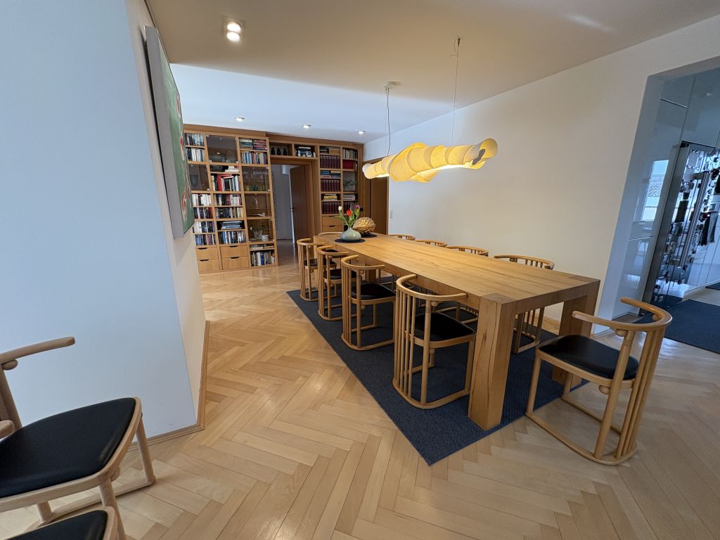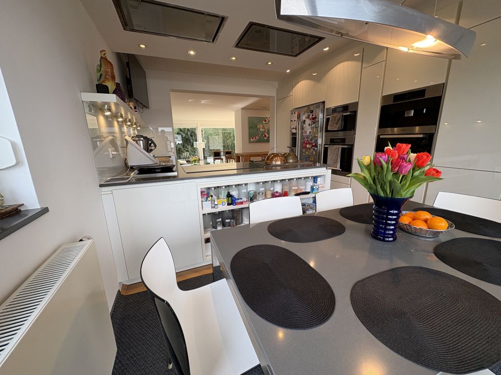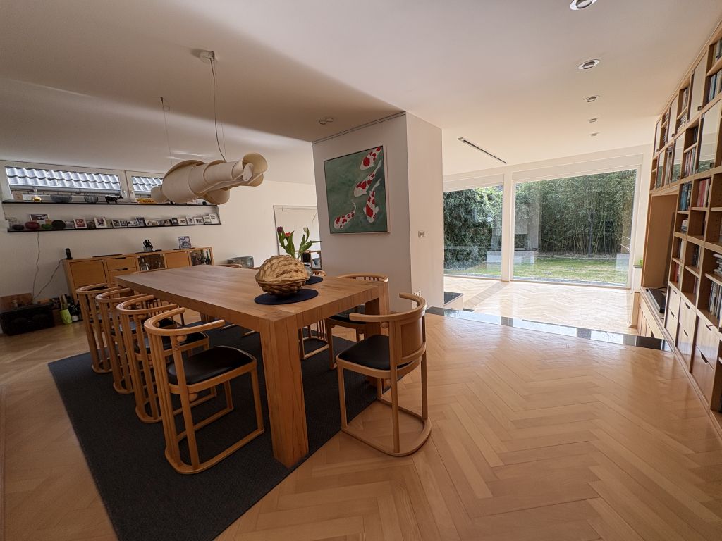 Großzügiger Wohnbereich mit separatem Eingang, offenem Wohn-/Essbereich, hochwertiger Küche mit Kochinsel, Kamin sowie direktem Zugang zur Südterrasse und in den Garten. Der hintere Wohntrakt umfasst zwei große Zimmer mit Ankleiden, ein modernes Bad mit Regenwalddusche, ein weiteres Badezimmer sowie ein Gäste-WC. Ergänzt wird das Angebot durch einen ca. 28 m² großen Fitnessraum mit Gartenzugang.