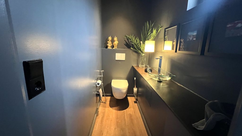 Der geräumige Eingangsbereich befindet sich auf der Grundebene des Hauses. Neben verschiedenen Funktionsräumen finden Sie hier ein großes Gästezimmer, ein Gäste-WC und einen hochwertigen Fitnessbereich mit Sauna und Dusche. Richtung Garten finden Sie hier die erste schöne Terrasse.
